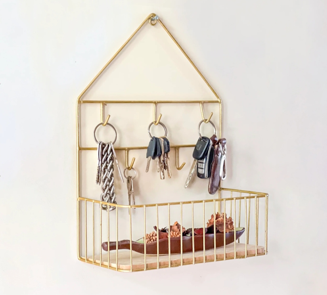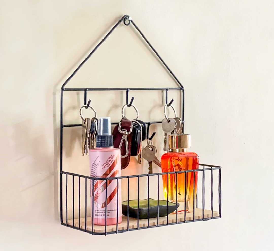 Say goodbye to misplaced keys and cluttered countertops. This House-Design Storage Basket Shelf is a functional masterpiece for the modern home. The geometric frame provides a charming “home” silhouette, while the dual-layer hook system and basket provide maximum utility in a compact footprint.
